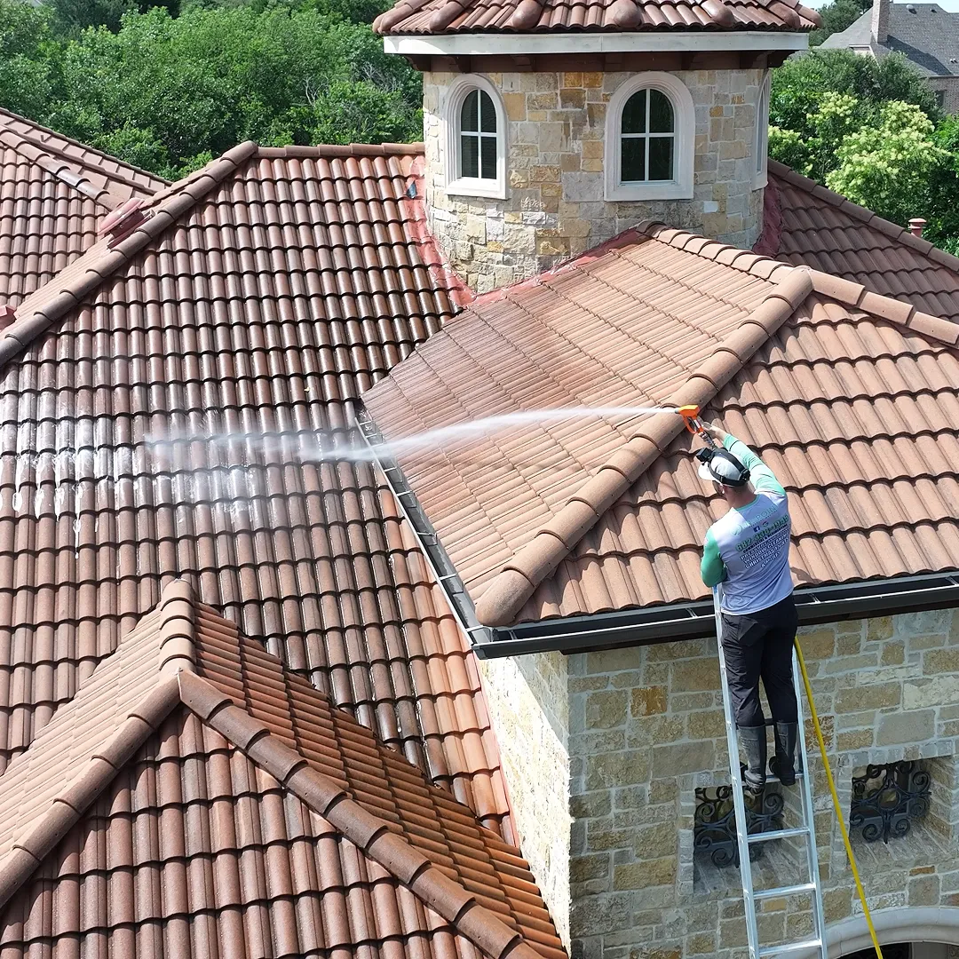At On Point, we specialize in restoring clay tile roofs across DFW using a safe, non-damaging softwash method. Our team removes algae, mold, and debris that silently eat away at your roof’s lifespan. By treating buildup early, we’ve helped homeowners avoid expensive replacements, improve curb appeal, and extend the life of their roofs — all while keeping their property looking pristine!
